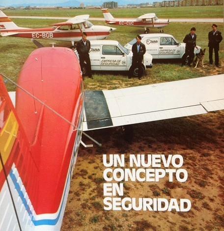 Folleto de promoción del Servicio Aéreo de Vigilantes Jurados, inédito y pionero a principios de los años 80, en el que además se pretendía reposicionar la imagen de preparación y valía de estos profesionales ante potenciales clientes.